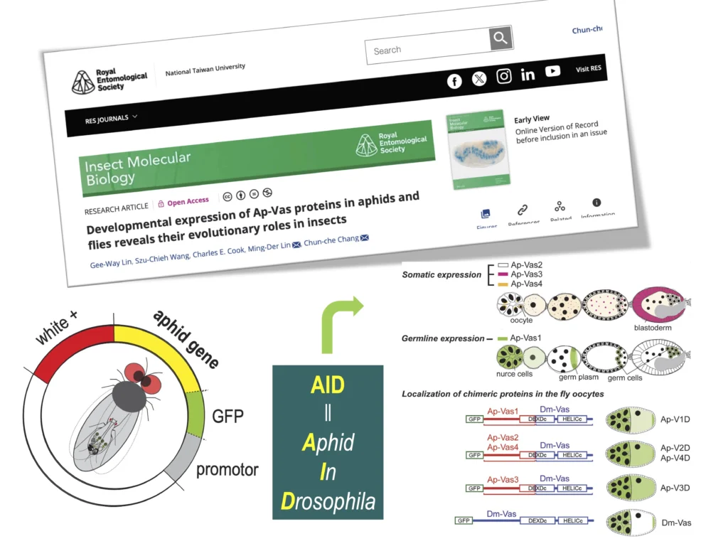 Chun-Che Chang, a joint faculty member of NTU CDBRM, published an insightful paper in early December 2025. Through the AID (Aphid in Drosophila) Project, his group and collaborators (including Ming-Der Lin and others) uncovered novel roles of the duplicated vasa genes in aphids, which are serious agricultural pests. By expressing aphid genes in Drosophila melanogaster—one of the best-studied model organisms—the team revealed unexpected somatic functions of these duplicated aphid vasa genes, which had long been regarded as germline-specific in most insects. Chang believes that this study will shed new light on the evolutionary and developmental roles of insect germline genes. The full article is published in the Royal Entomological Society’s journal Insect Molecular Biology:https://resjournals.onlinelibrary.wiley.com/doi/10.1111/imb.70020