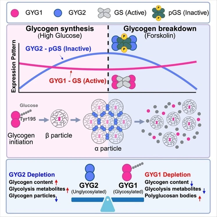 肝醣是人體主要的葡萄糖儲存型態,人類具有兩種肝醣核心蛋白—GYG1與GYG2,本研究指出兩者具有不同的功能,在肝醣合成的起始階段,GYG1 會進行自我糖基化,形成較小的β顆粒;而GYG2僅有極低的自我糖基化能力,本研究進一步發現GYG2會抑制肝醣合成酶 (GS)的活性,並且將β顆粒彼此連結,組裝成較大的α顆粒,透過不同大小的顆粒進而穩定肝醣的儲存與利用。本研究不僅揭示了 GYG1 與 GYG2 在肝醣代謝中的精細分工,更為肝醣結構異常相關的代謝疾病提供了潛在治療方向。